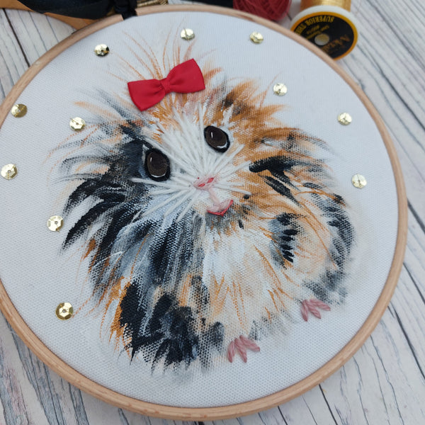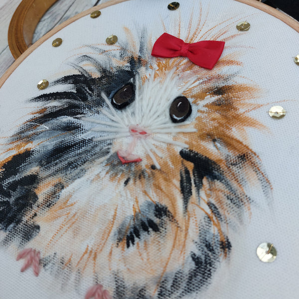 Painted into cotton using fabric paints this cute guinea pig has painted fabric eyes that have been sewn on, wool stitching and she is surrounded by gold coloured sequins.