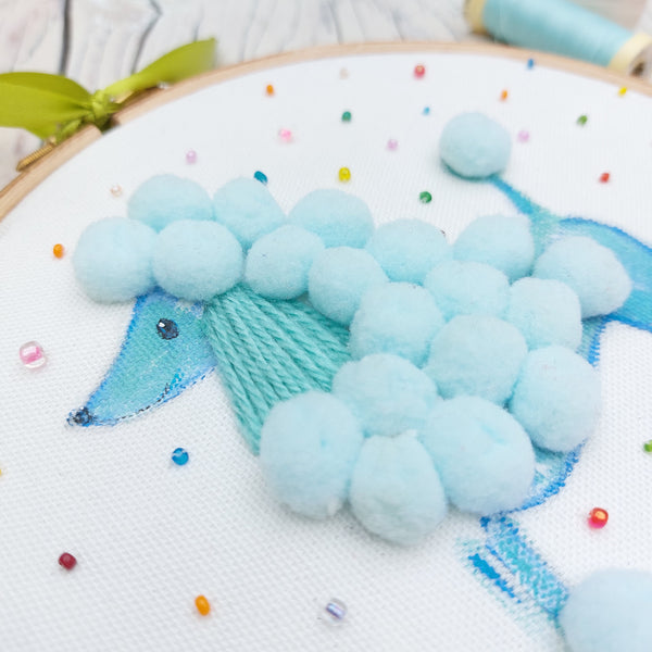 Blue poodle has been painted onto fabric using fabric paints then embellished with thread and pom poms. Surrounded by multicoloured beads.