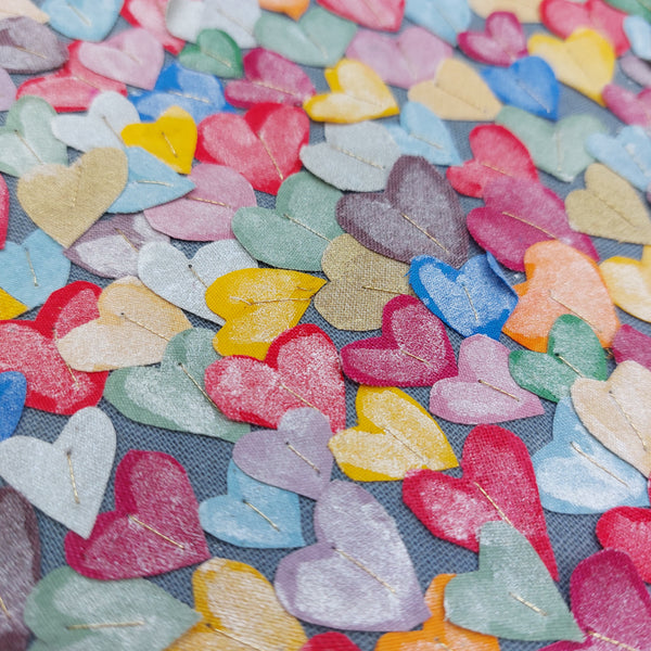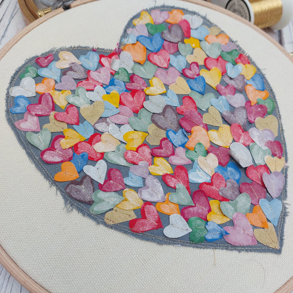 Beautiful heart themed hoop art covered with multicoloured love hearts.