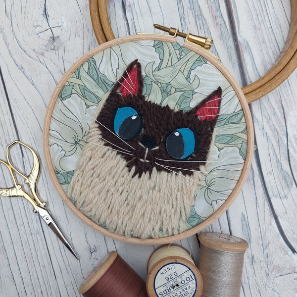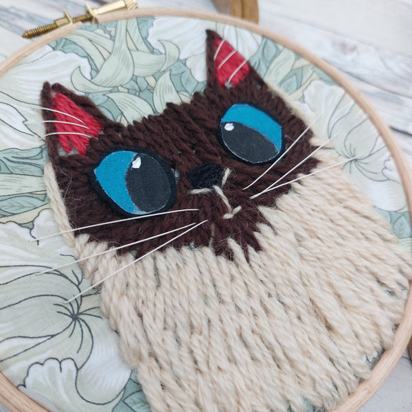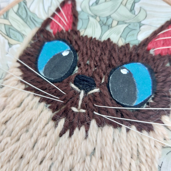 Mr Pickles is sewn onto fabric using wool. His fabric eyes are then added along with his fabulous whiskers.