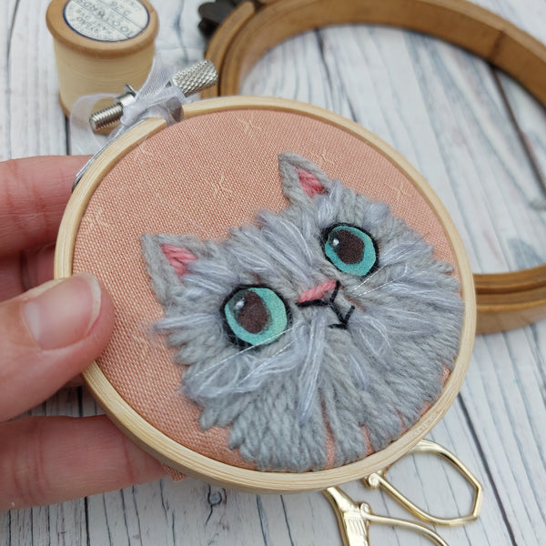 A mini piece of cat art. Shades of grey wool stitched onto fabric to make this little cutie. His eyes have been painted onto fabric.