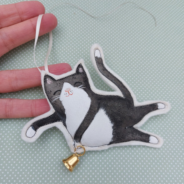 This cheerful fellow has been painted onto fabric and them sewn onto felt and lightly filled. He holds a little bell and a piece of ribbon is attached for hanging.