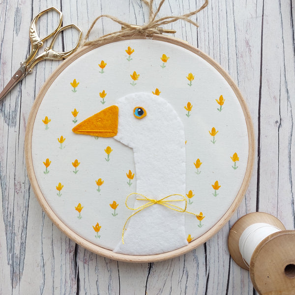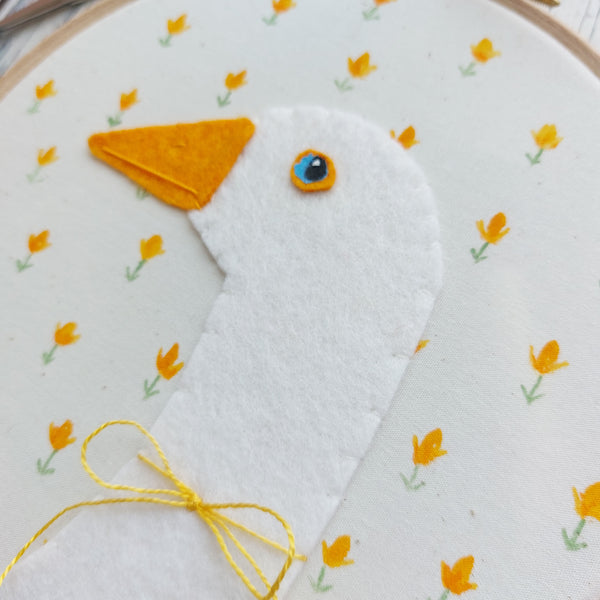 Pretty goose is cut from felt, sewn onto a background of calico fabric painted with tiny yellow flowers.