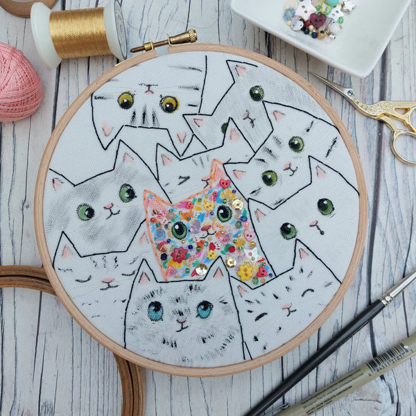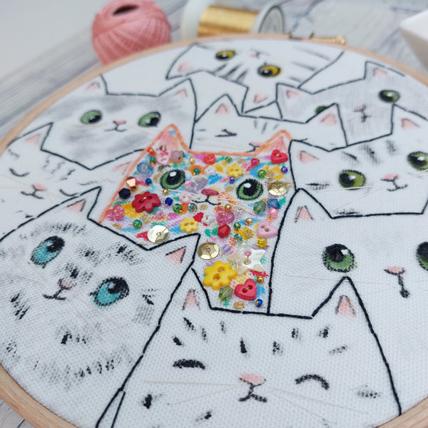 Colourful cat is adorned in vibrant beads and sequins - shining amongst his monotone friends.
