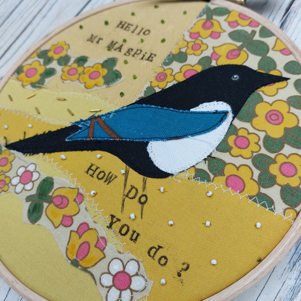 The background is made from pieces of fabric stitched together, embellished with beads. The magpie is cut from fabric pieces and has a gand painted eye.
