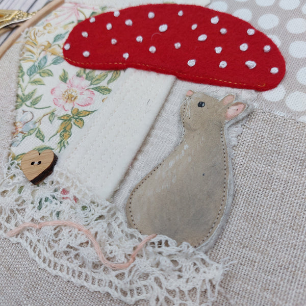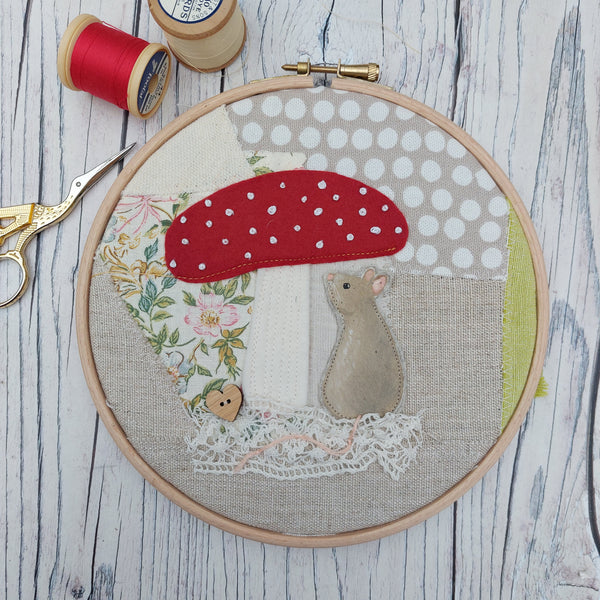 Mouse under a toadstool textile art framed in a 7" embroidery hoop.