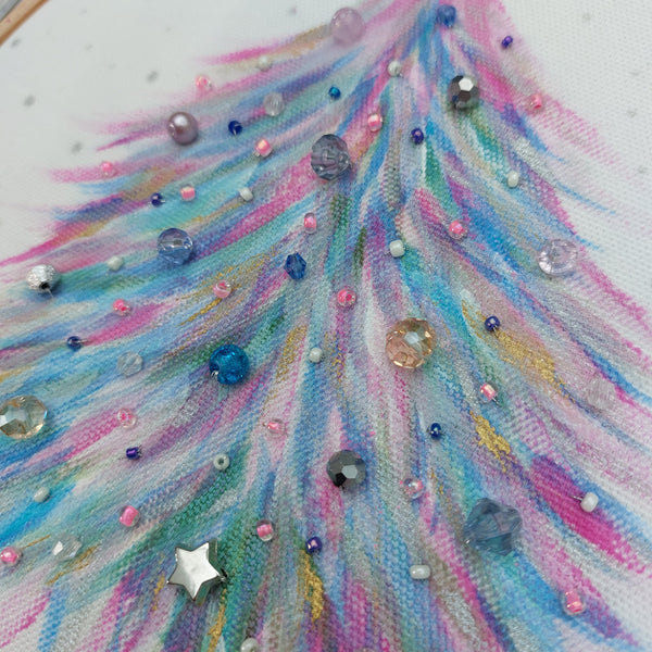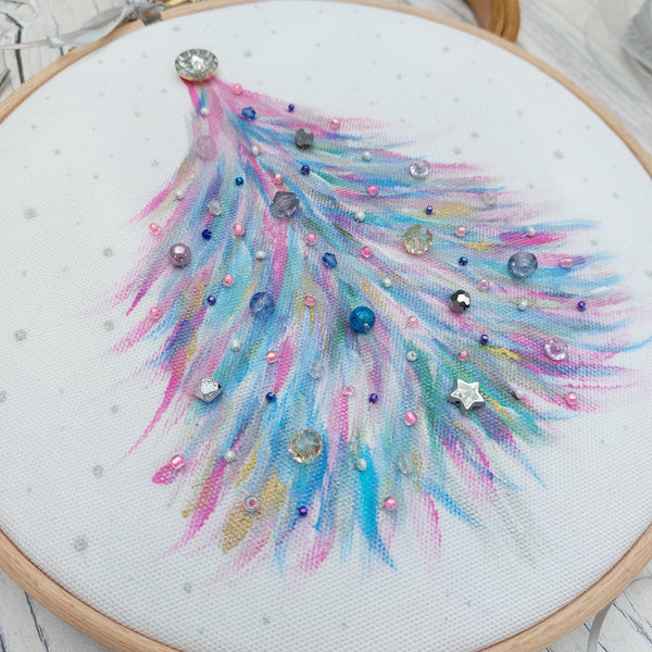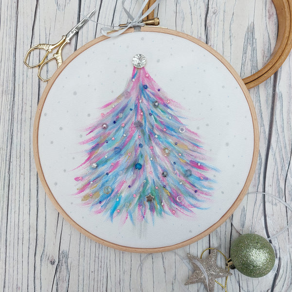This pretty Christmas tree art is framed in an 8" British made embroidery hoop.