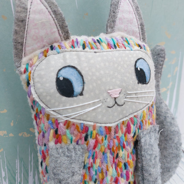 He is cut from thick wool felt with a fabric face and painted eyes.
