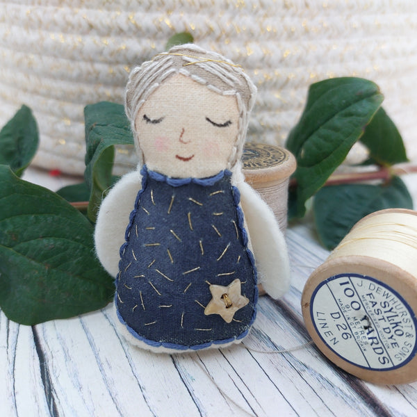Each little angel has been painted onto fabric, then embellished with embroidery, beads and two with buttons. Gently filled with felt wings.